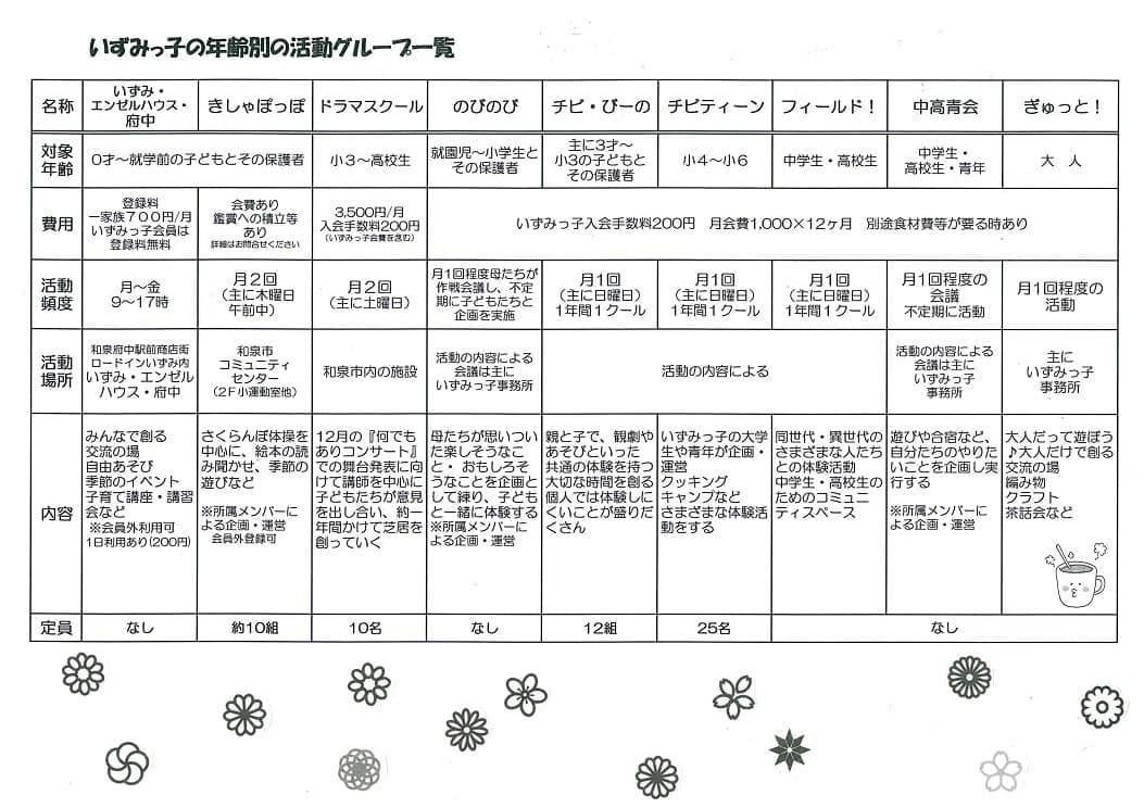 TOP > 活動内容 活動一覧 年令にあった自主活動グループ、また、年令を越えた子どもから大人までのつながりの中で様々な活動をしています。子ども市やキャンプ他、体験遊び等多数の活動があり、自由に参加することができます。 年令別で活動するグループの表があります きしゃぽっぽ チビ・びーの のびのびひろば チビティーン フィールド! 中高青会 ぎゅっと! ドラマスクール こども市 高学年キャンプ 何でもありコンサート お問い合わせ ホームページの利用について